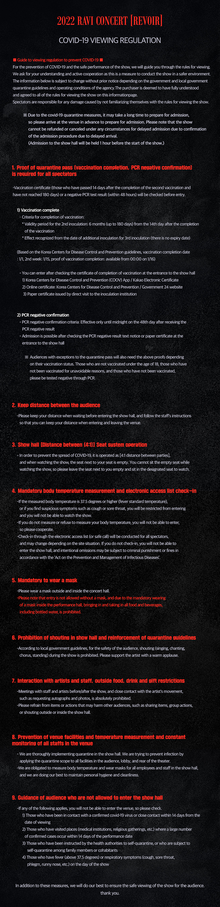 We would like to inform you that the 2022 RAVI CONCERT [REVOIR], which was scheduled to be held at the Olympic Hall from February 25-27, 2022, has been temporarily postponed. We made every effort to provide a safe and good show to the audience, but the show was inevitably postponed due to the spread of COVID-19 Omicron mutation.